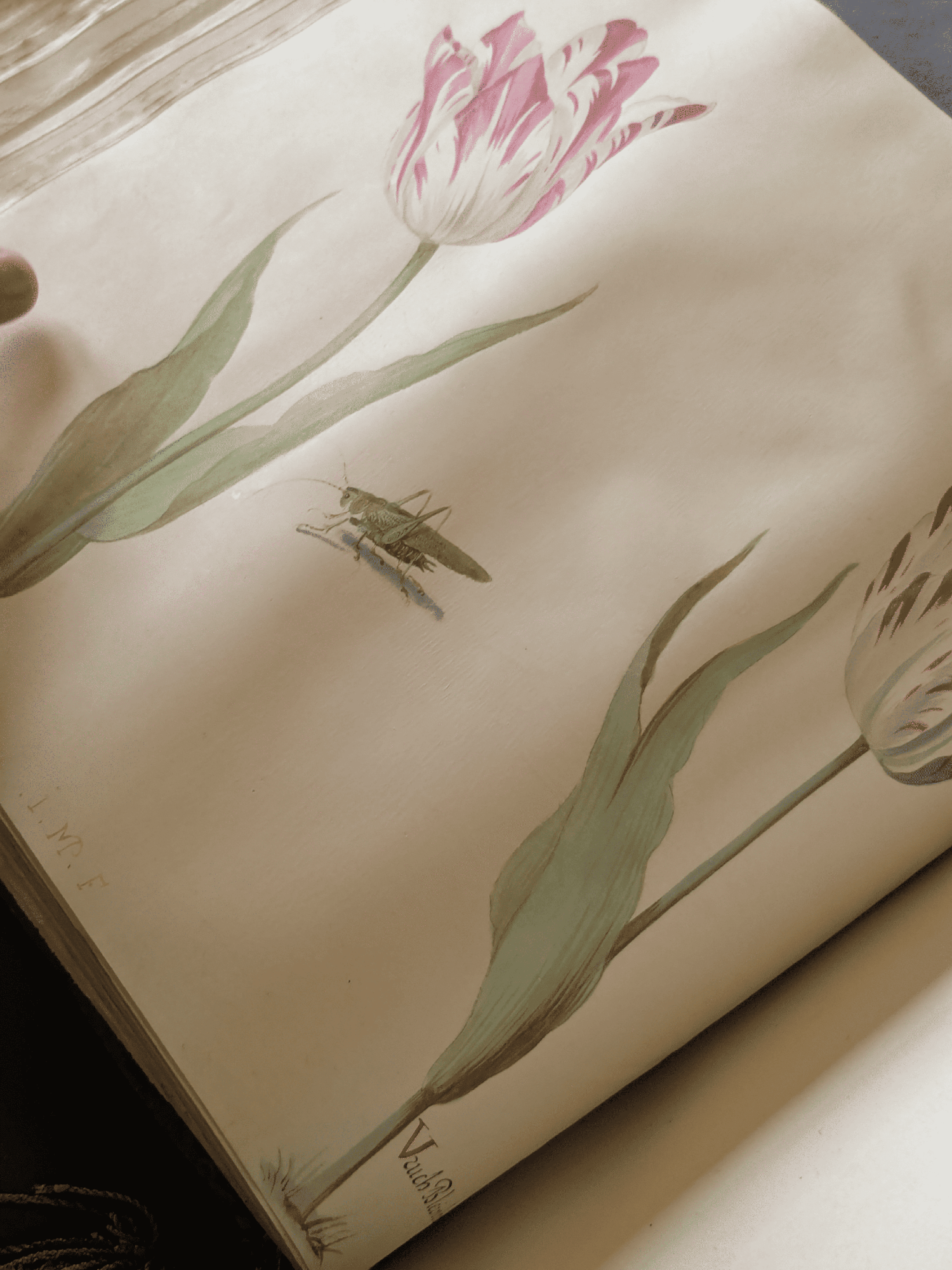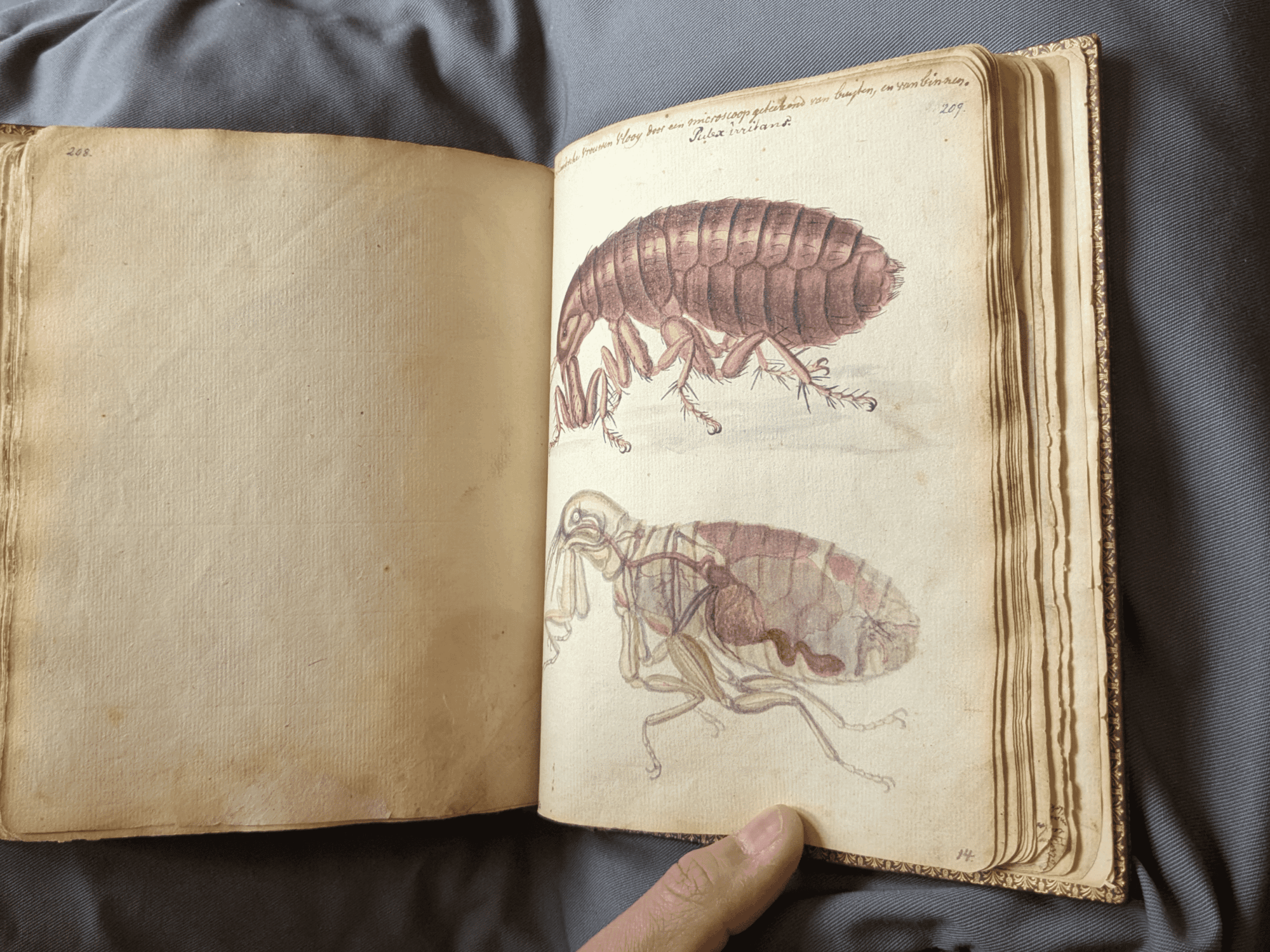 The team not only looked at drawings, but also studied some wonderful albums. While we couldn’t get our hands on the Anselmus de Boodt albums – which are currently on show in the Rijksmuseum – we did got the opportunity to take a closer look at the Tulip book of Jacob Marrel (1613/1614 – 1681) and the sketchbook of Jan Brandes. The Tulip Book (1640) contains many meticulously drawn tulips in all colors imaginable. Sometimes the colors are accompanied by insects like flies, dragonflies, wasps, butterflies and beetles. The exact function of the book is unclear; it could have been a kind of shopping catalogue where an interested buyer could pick out his selection, an inventory of tulips or maybe it functioned more like a priced possession (a kind of coffee table book, if you will). Although the Tulip Book mainly focuses on the world of tulips, Jan Brandes (1743-1808) depicted a whole range of things in his sketch book. During his stay in Batavia, Ceylon and Southern Africa, Brandes made a large number of drawings. Subjects ranged from (silhouette) portraits and depictions of plants, birds, reptiles, fish, mammals and insects to city sights and life in these parts of the world. Depicted for example is a colored overview of the binding of elephants, a table setting for dinner and a tea visit to a European house in Batavia. Described is the call of certain birds and a method on how to preserve insects. It even contained a drawing of a flea which was made aided by the microscope, as noted by the accompanying text.